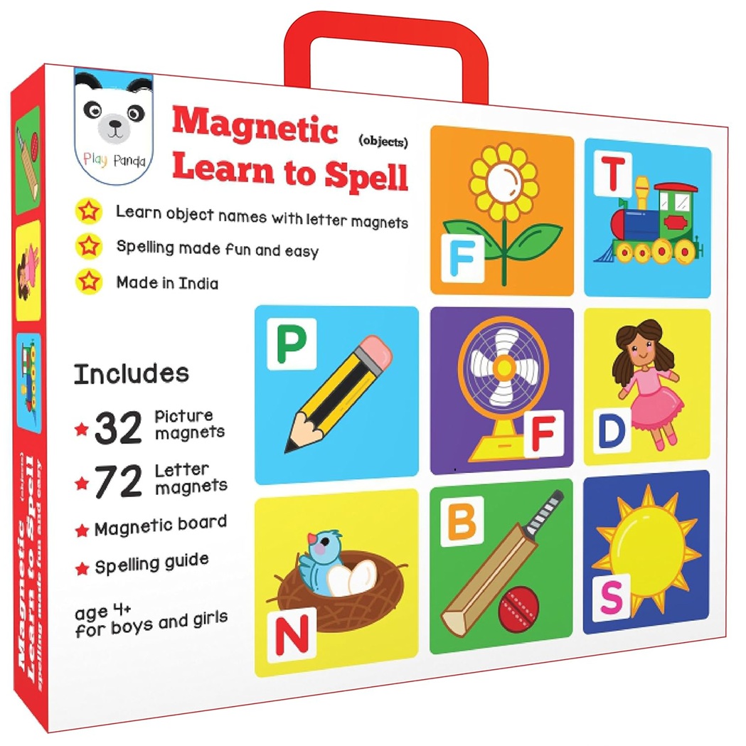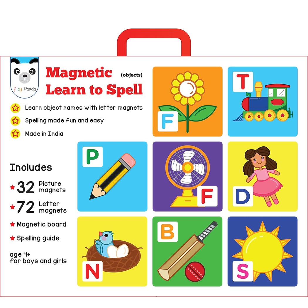 β Complete Learning Set: 32 picture magnets depicting everyday objects (sun, pencil, doll, bat, etc.),Β 72 letter magnets for building multiple words,Β Magnetic board as the play and learning surface,Β Spelling guide to assist and guide young learners.