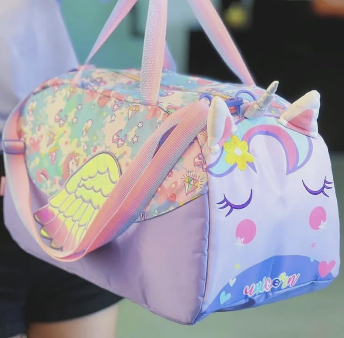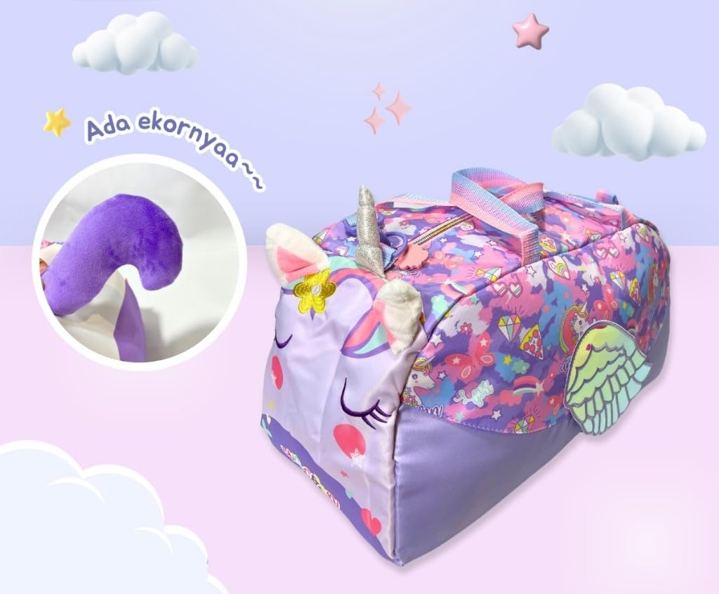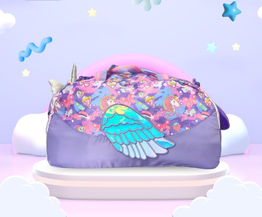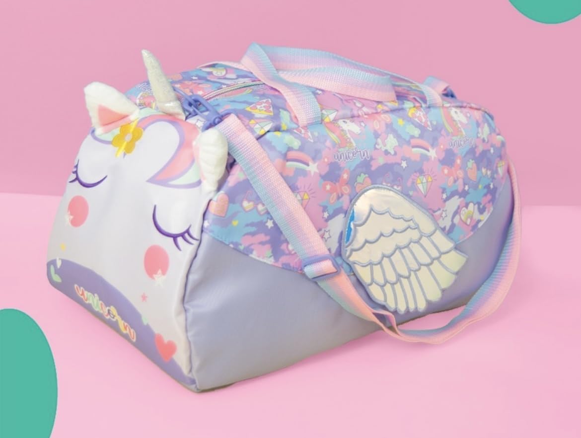 Covered in a vibrant pastel palette, the bag features joyful prints of rainbows, stars, pizza slices, diamonds, strawberries, and of course—unicorns! The word “unicorn” is subtly written across the body, enhancing the magical theme.